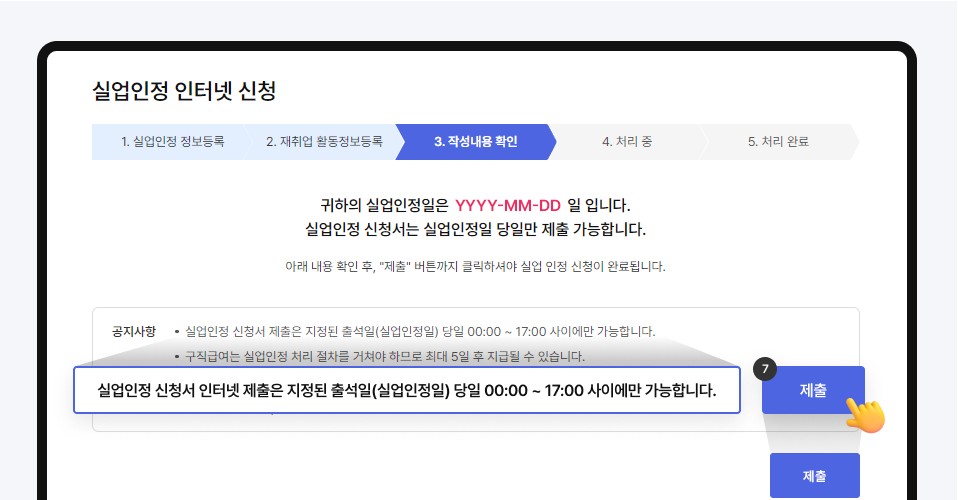 7. 작성내용 확인 및 제출 실업인정 신청서 인터넷 제출은 지정된 출석일(실업인정일) 당일 00~17:00 사이에만 가능합니다.